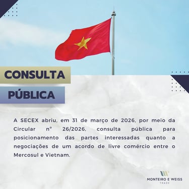 A SECEX abriu, em 31 de março de 2026, por meio da Circular nº 26/2026, consulta pública para posicionamento das partes interessadas quanto a negociações de um acordo de livre comércio entre o Mercosul e Vietnam.