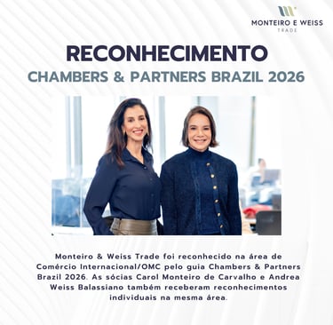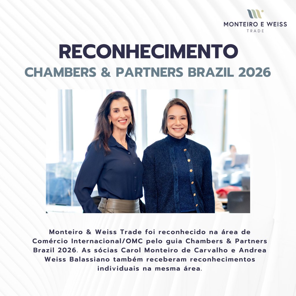 Andrea Weiss Balassiano e Carol Monteiro de Carvalho foram reconhecidas no ranking da Chambers and Partners | Brazil Guide 2025, na categoria International Trade/WTO - Band 2. O Escritório Monteiro & Weiss Trade também foi ranqueado na mesma categoria.